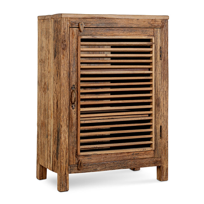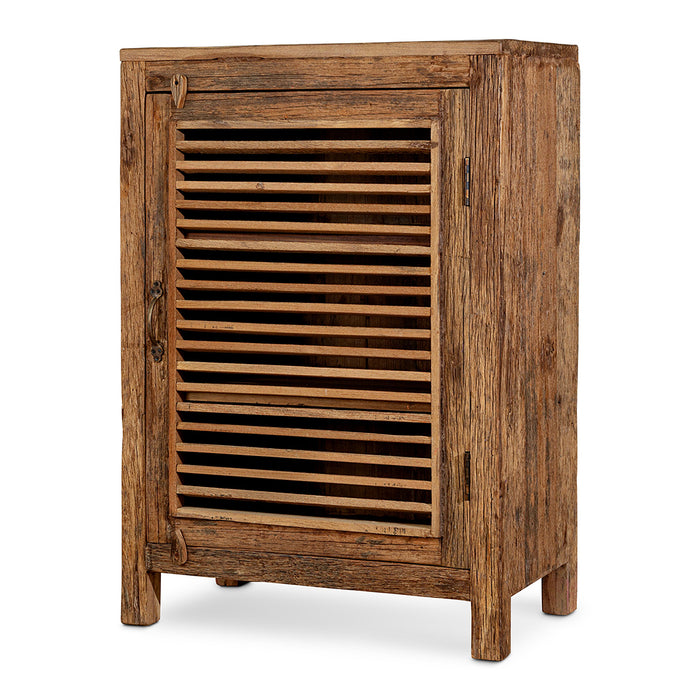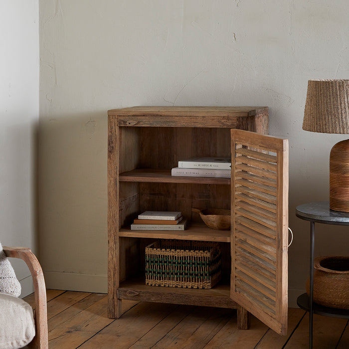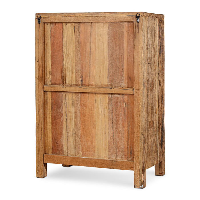 Handcrafted from salvaged timber reclaimed from vintage Indian transport vehicles, this chunky, single door cabinet embodies artisanal heritage. Its weathered surface - marked by natural knots and fissures - ensures that every piece is unique. The understated design features a soft, sun-bleached finish that complements contemporary and traditional interiors alike. Two internal shelves deliver functional storage space within a compact footprint, making this a versatile addition to living spaces, entryways, or dining rooms where character and practicality converge.