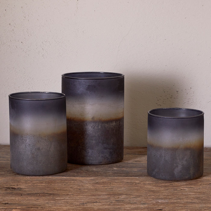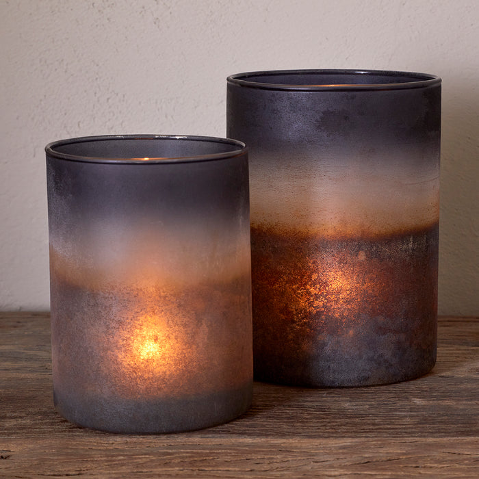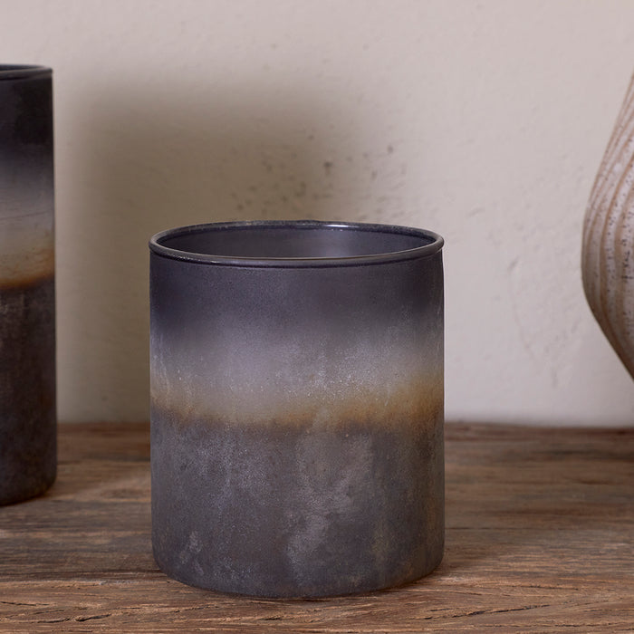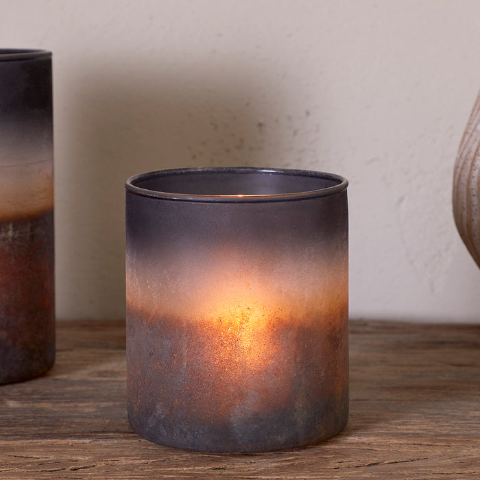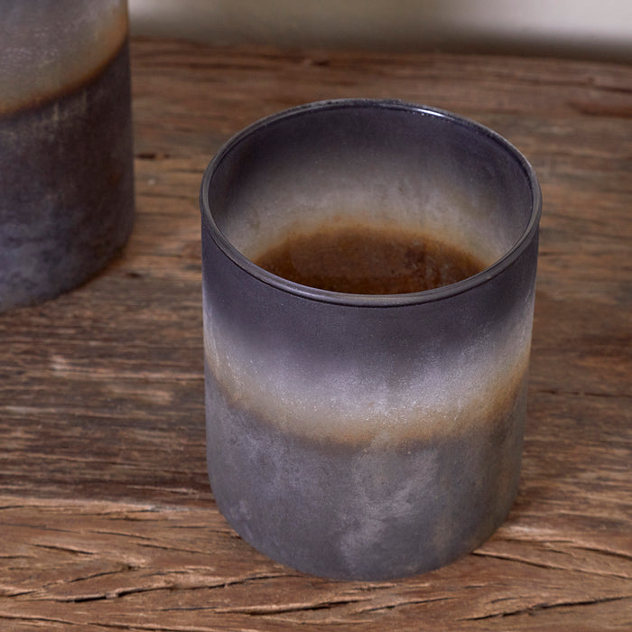 This tealight holder is a muted combination of navy and smoke shades, casting a gentle, ambient light when lit. Its layered colours and subtle rustic finish provide depth and visual appeal, making it ideal for both seasonal décor and everyday use. Available in three sizes and perfect when grouped as a set of three. Each holder is expertly crafted from hand-blown recycled glass with a smoky tint, uniquely shaped by hand to introduce slight variations, and finished with layered navy and rustic textures for a distinctive tonal appearance.