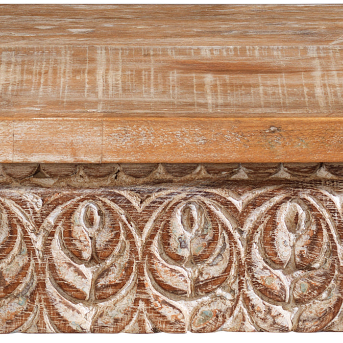 The natural mango wood has been finished with a soft whitewashed patina that gently highlights the carved surfaces while allowing the warm tones and grain of the timber to show through. This subtle finish gives the table a lightly aged appearance that enhances its rustic charm.