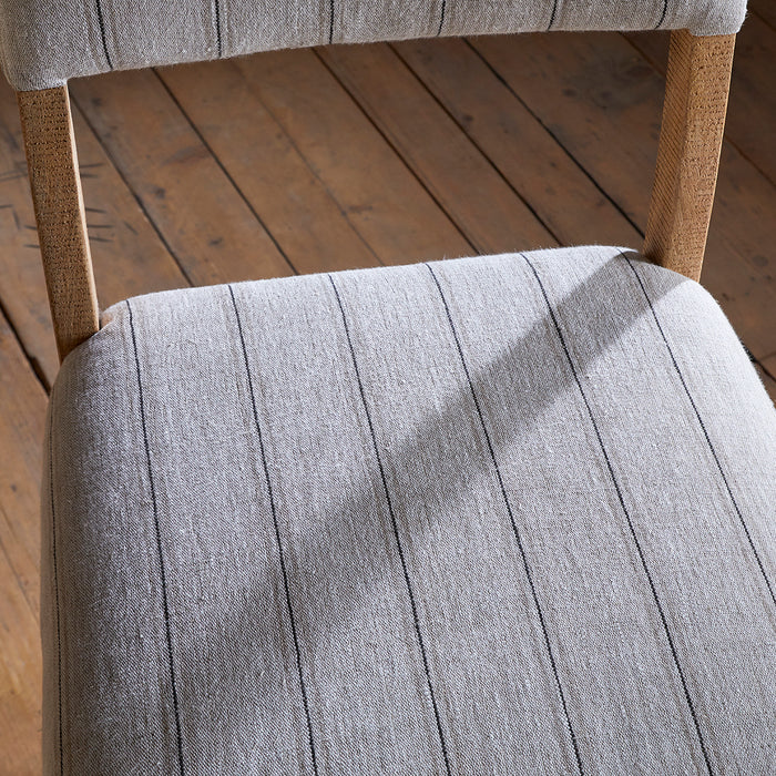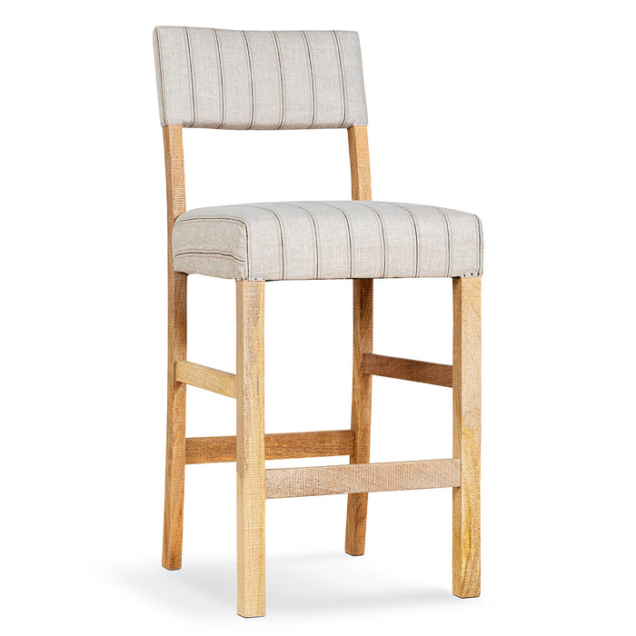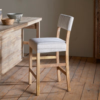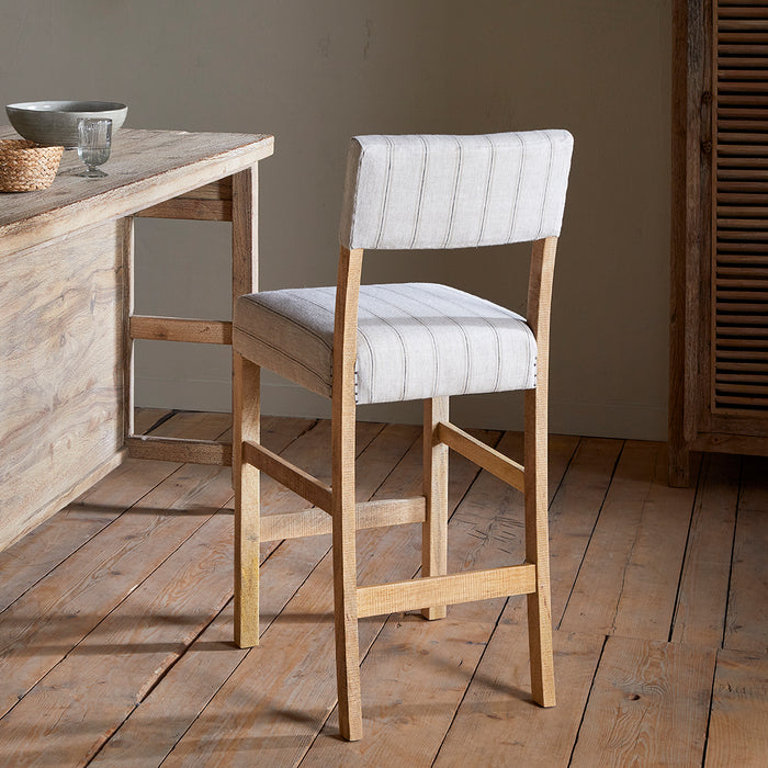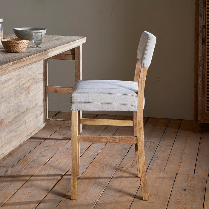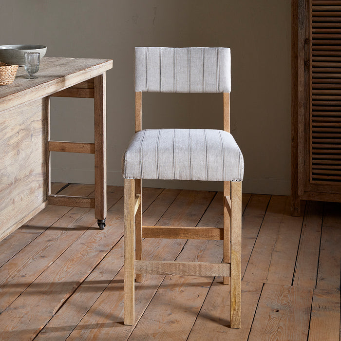 Created for both form and function, this comfortable counter chair pairs a robust mango wood frame with soft, natural linen upholstery. The subtle charcoal striping adds visual depth without compromising the chair's understated elegance, whilst the solid construction ensures durability in high-traffic kitchen and bar areas. The chair's clean design and muted colours make it equally suitable for any interior, from minimalist contemporary spaces to warmly textured traditional settings.