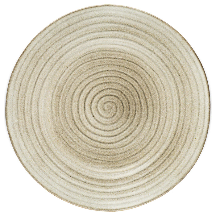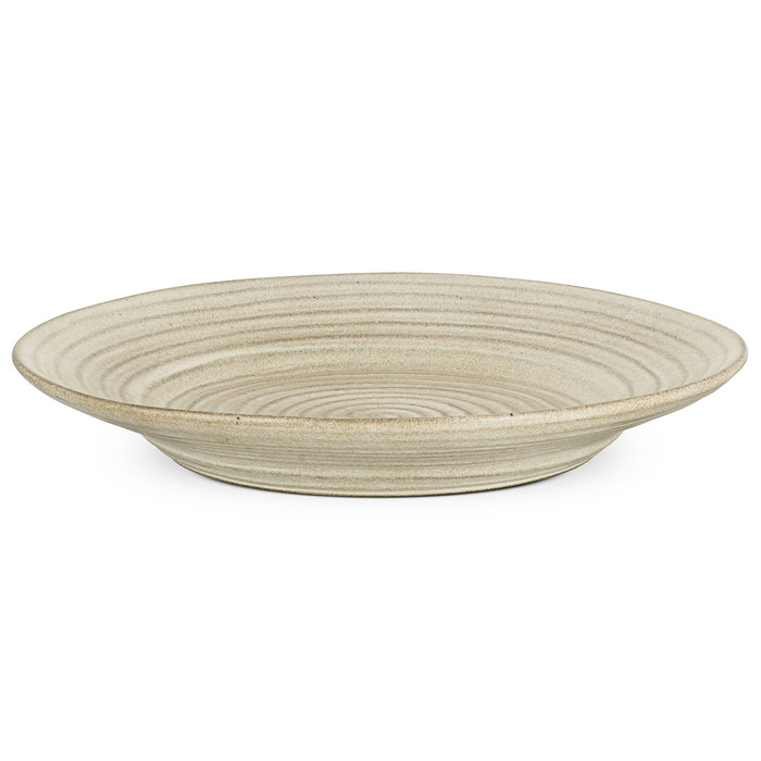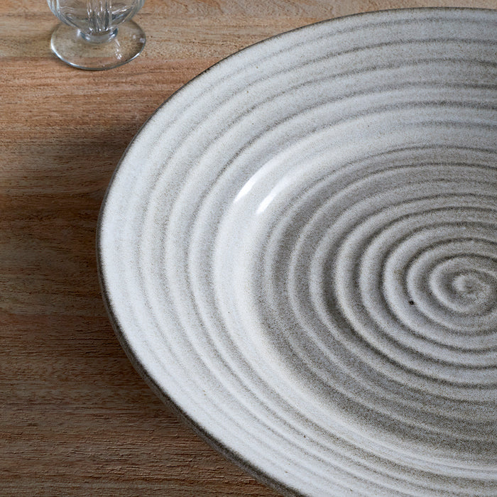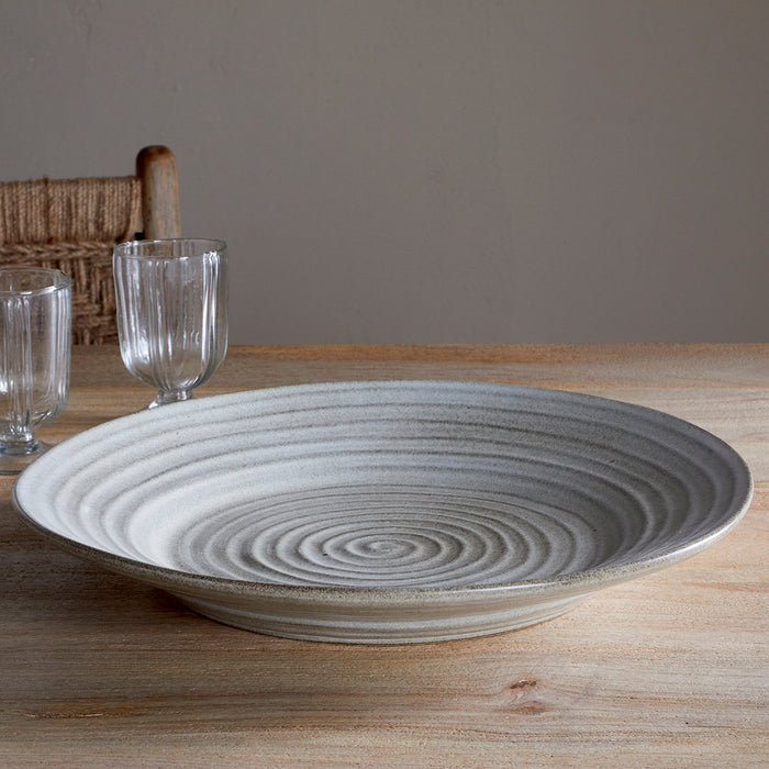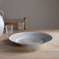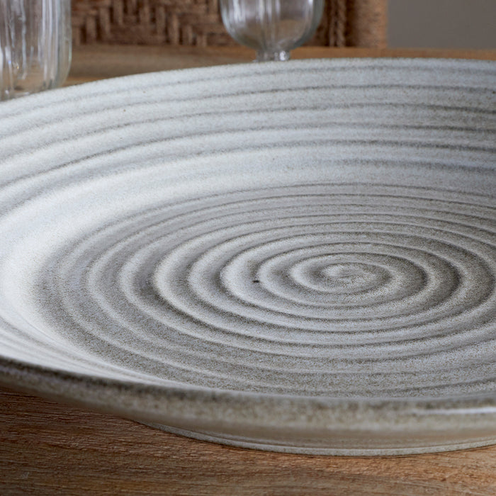 This large round platter offers a refined addition to our serveware range. Featuring a deeply complex reactive glaze, each platter showcases slight tonal differences alongside a distinctive textured spiral pattern, ensuring uniqueness. This elegant piece is ideal for presenting cakes, pastries, or charcuterie. Each item is shaped from locally sourced Portuguese clay, hand-poured into molds, and expertly finished. The layered reactive glaze creates tonal variations that reveal the maker’s craftsmanship.
