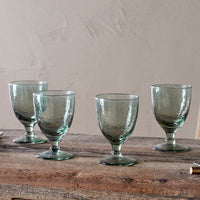 Introducing a Sage Green variant to our popular recycled Yala glass collection, these wine glasses feature a delicate hammered texture that creates a subtle shimmer. Designed with a traditional bowl and a shorter, robust stem, this set of four offers an elegant yet durable option for your table. Ideal for combining with other Yala pieces, these glasses bring a refined yet vibrant touch to your dining experience.