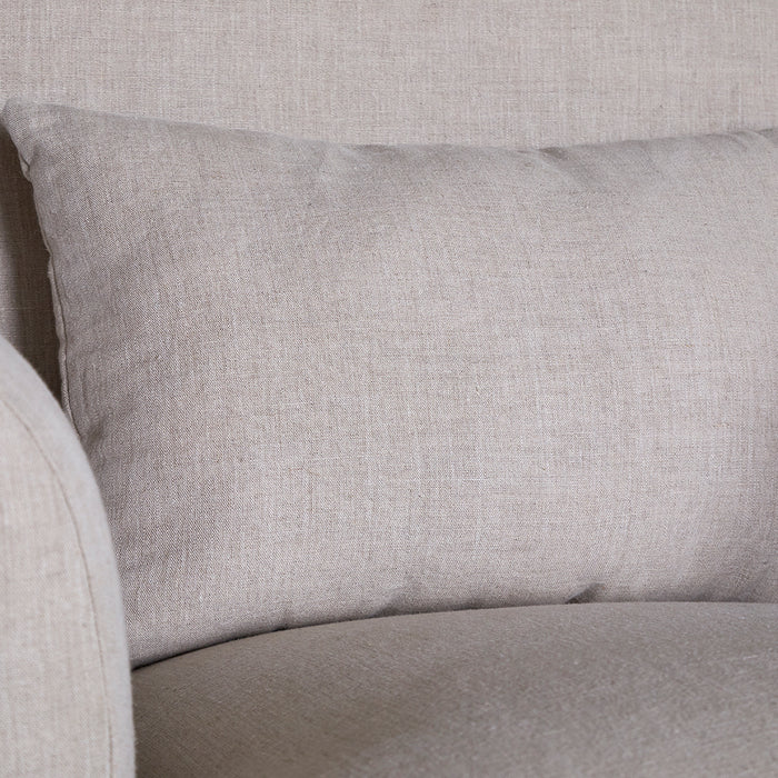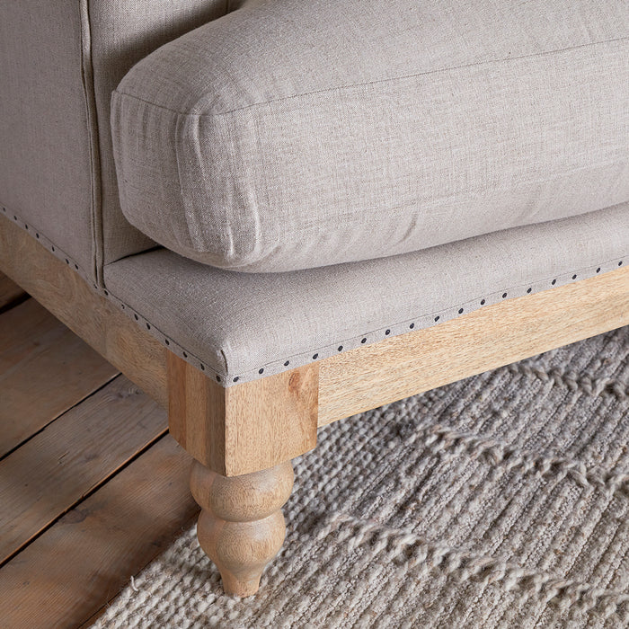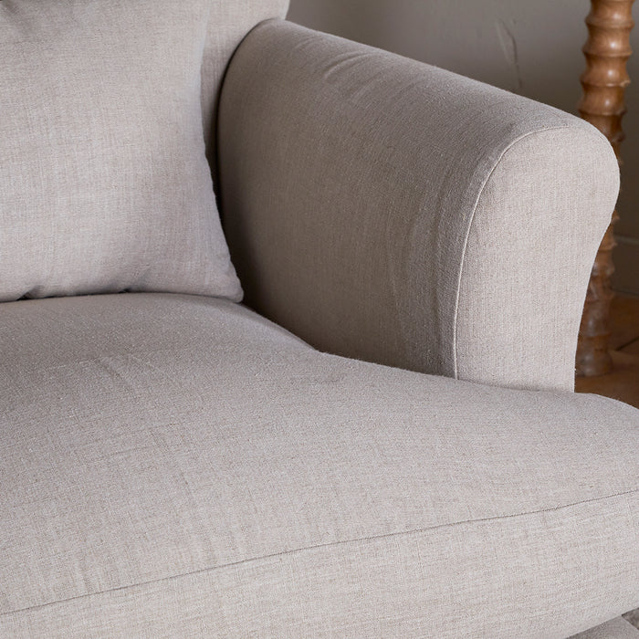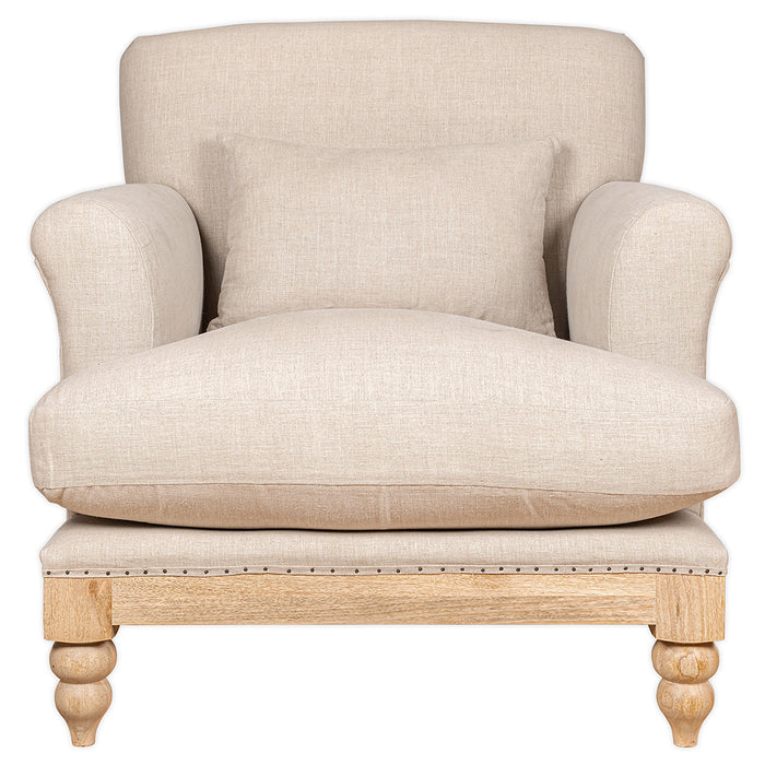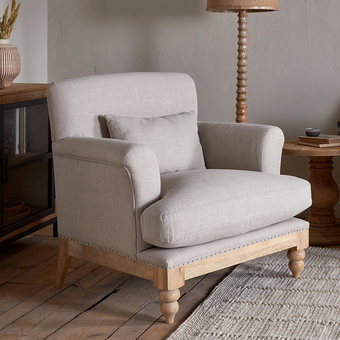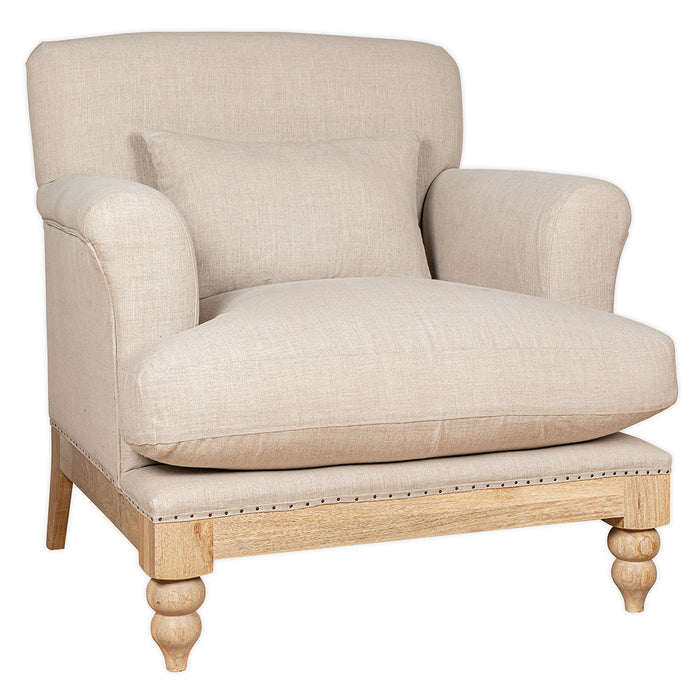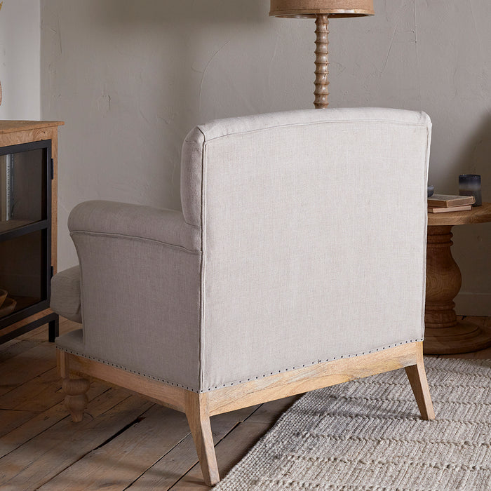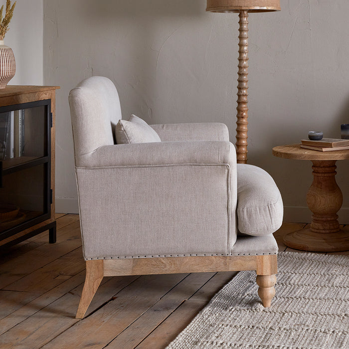 Spacious and elegantly understated, this armchair combines comfort with distinctive charm. Covered in natural linen, its enduring design is enhanced by a solid mango wood base with delicately carved feet, perfect for a snug corner or reading area. Carefully handcrafted, the chair features soft, resilient linen upholstery and a solid mango wood frame, skillfully carved and finished by experienced craftsmen. The wood is sustainably harvested as a by-product of mango farming, supporting both ecological responsibility and community wellbeing.
