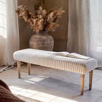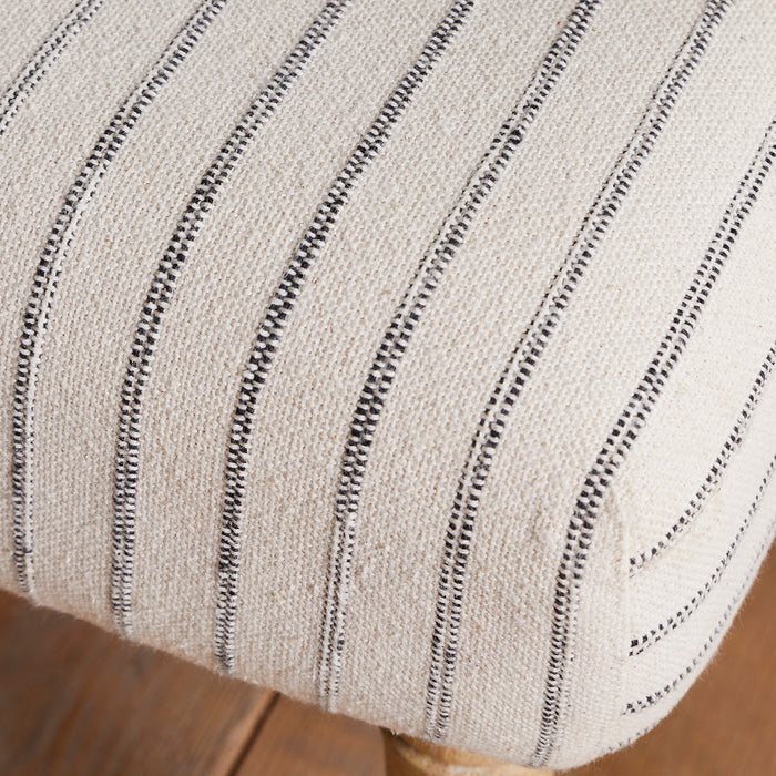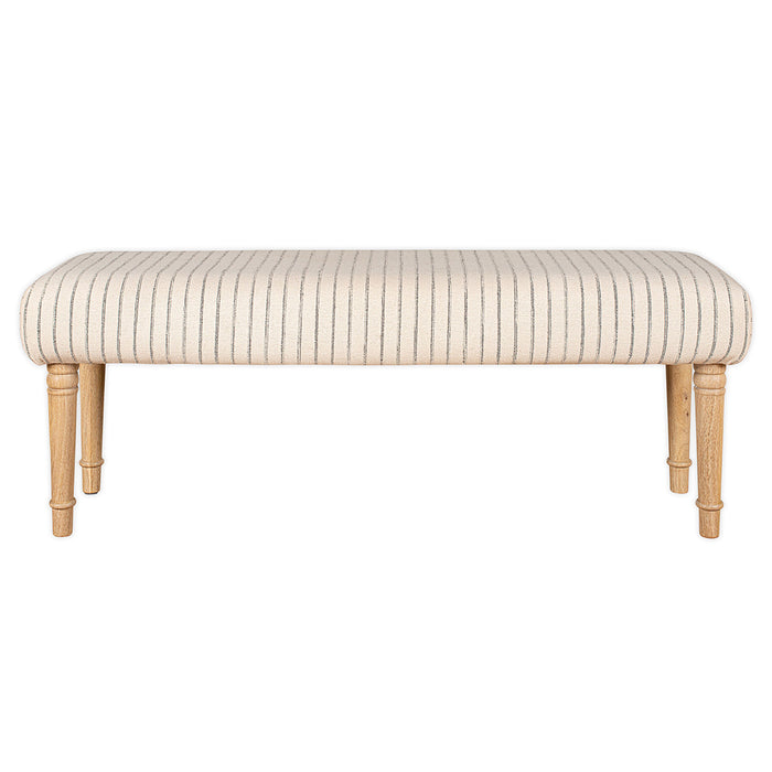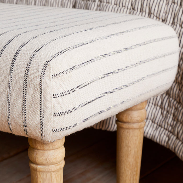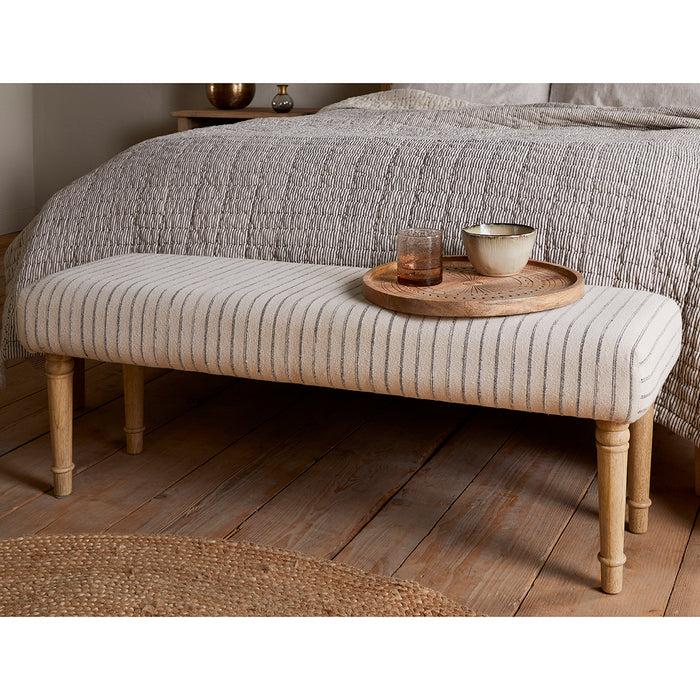 This versatile bench combines timeless style with gentle pattern. The natural cotton upholstery features a subtle black stripe design, refined and understated, yet full of character. Its slim profile makes it an ideal fit for the end of a bed or a hallway, while the sculptural wooden legs add a touch of elegance. A simple, stylish addition to any space.