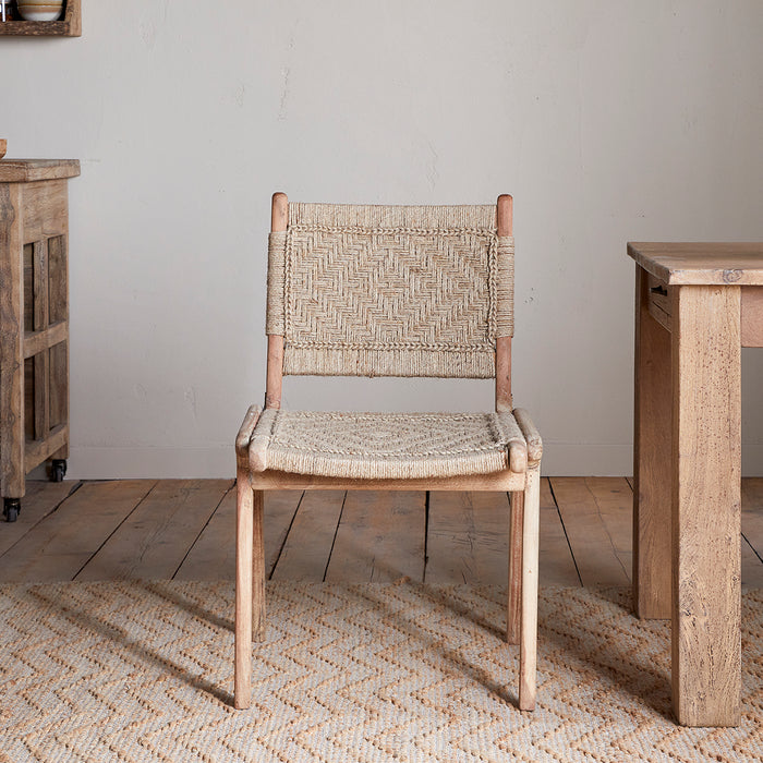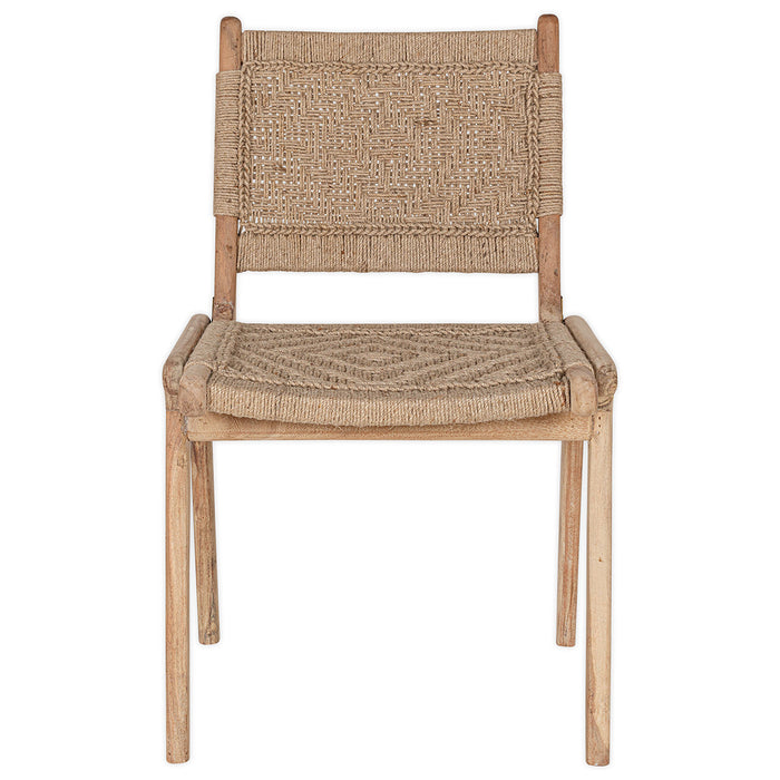 This armless dining chair, a useful addition to our popular Vinay line, features a sturdy acacia wood frame complemented by handwoven jute panels on the seat and back. Combining the warm tones of solid acacia with the natural texture of jute, it brings both durability and aesthetic appeal. Expertly crafted, the chair showcases the wood’s distinctive grain and offers breathable comfort through its woven seat and back, all arranged within a sleek, sculptural form.