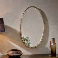 With a beautiful antiqued brass finish to the frame, the curved edges elongated oval shape give a vintage, elegant look to this wall mirror. The warm brass tones combined with the elegant shape make this a stylish option as a hallway or bedroom mirror. Made from cast aluminium with a slightly distressed, textured finish.