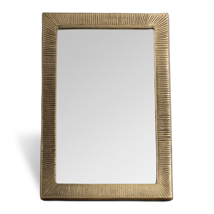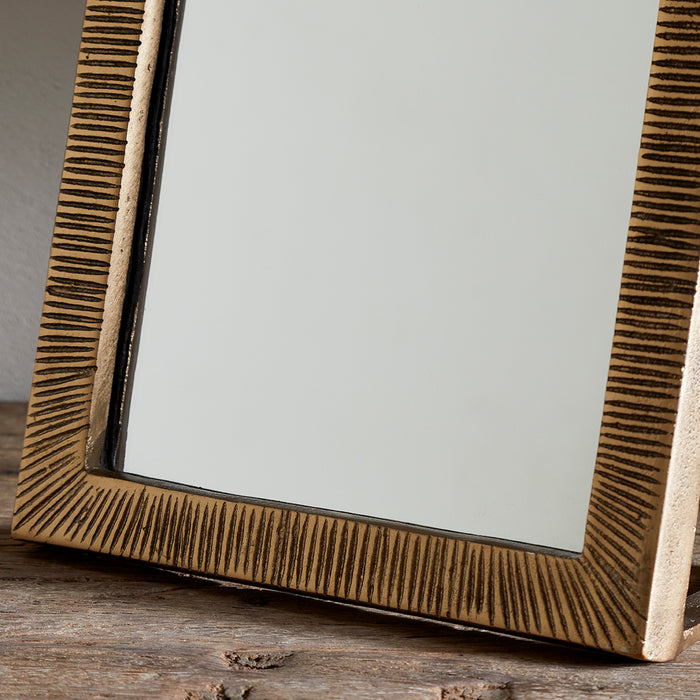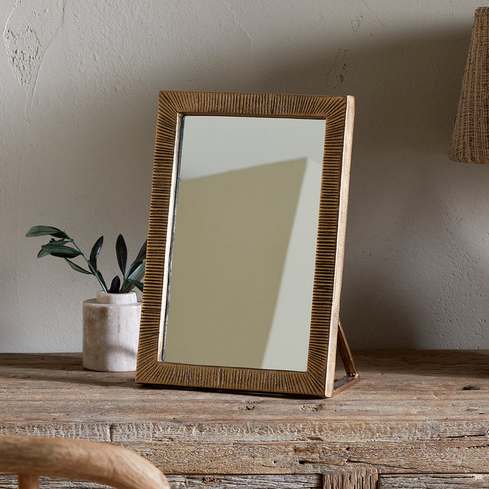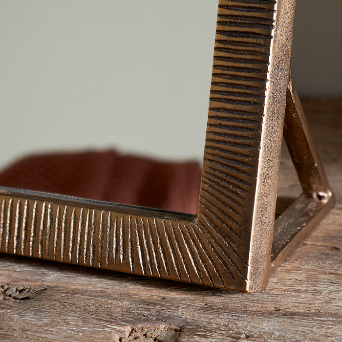 Ideal in a bedroom on a dressing table, or as a bathroom vanity mirror, this lovely little mirror is made from cast aluminium, given a warm tone with an antique brass finish. The frame features a subtly etched pattern, adding texture and an extra layer of handcrafted detail. Designed to stand independently, it would add elegance and function to any surface.