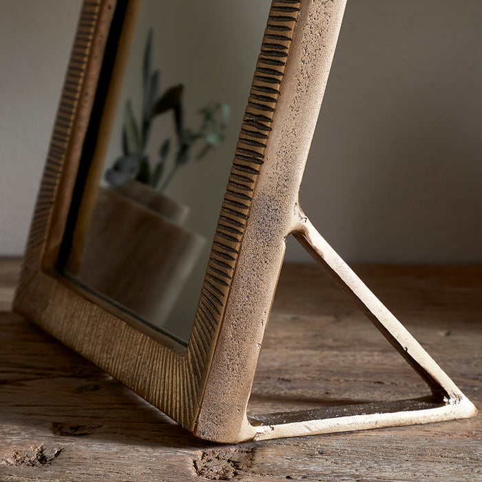 Constructed from solid cast aluminium, this standing vanity mirror is perfect on your dressing table. Its natural metal texture and gentle sheen le...