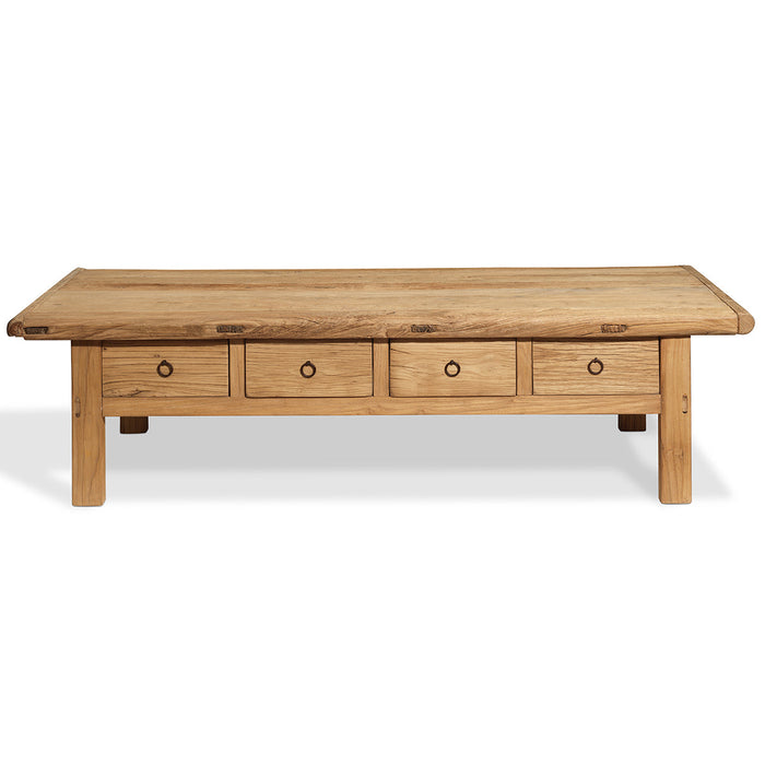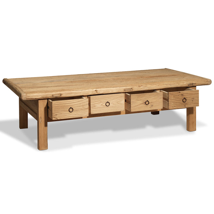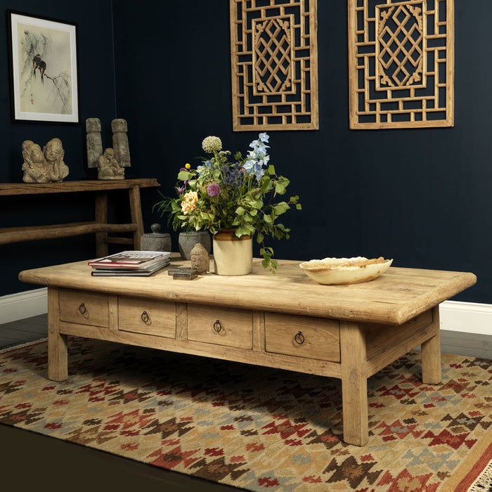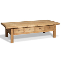 Like the other pieces in the range, this large coffee table is crafted from reclaimed elm wood. Four drawers on each side provide useful storage space and are each fitted with a simple ring handle. The table's sturdy design, complete with thick frames and slightly splayed legs, gives a solid, robust feel and the weathered elm wood, reclaimed from old agricultural buildings, has a wondeful, tactile quality. Note that each table may vary slightly from the examples pictured due to the reclaimed materials used and handmade nature of the range.