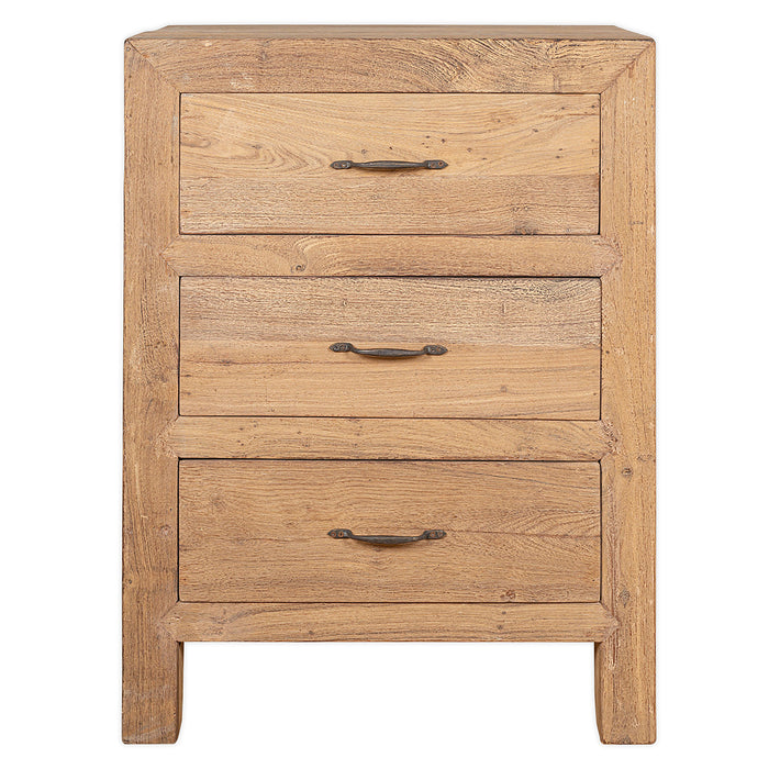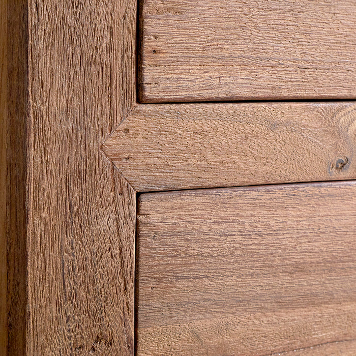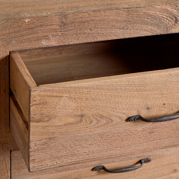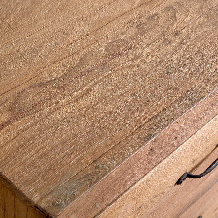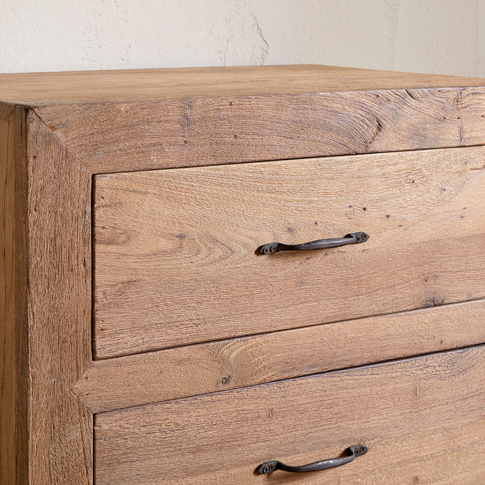 This small chest of drawers blends rustic elegance with enduring style and is crafted from reclaimed wood with a robust, substantial build, A multifunctional piece that adds warmth, texture, and distinctive character to daily living. Also available in a larger double size. Expertly hand-carved and assembled by skilled artisans, the wood is sourced from the ceiling beams of traditional Indian homes. Each piece is selected for its unique grain, patina, and aged character, then crafted into a solid frame featuring dovetail joints for enhanced durability, finished with antique brass iron handles that lend a timeless touch.