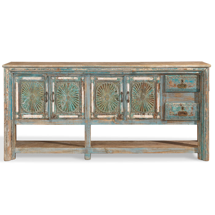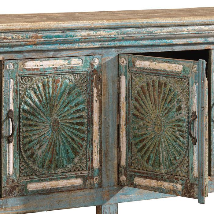 The front is defined by a series of intricately carved vintage cupboard doors, each centred with a radiating sunburst motif in an Indo-Portuguese style. The original paint has naturally worn over time, revealing layers beneath and lending the surface a textured, almost painterly quality. Subtle accents of cream and earthy undertones soften the blue, enhancing its depth and character.