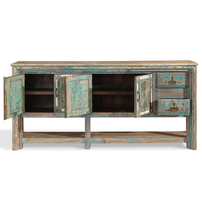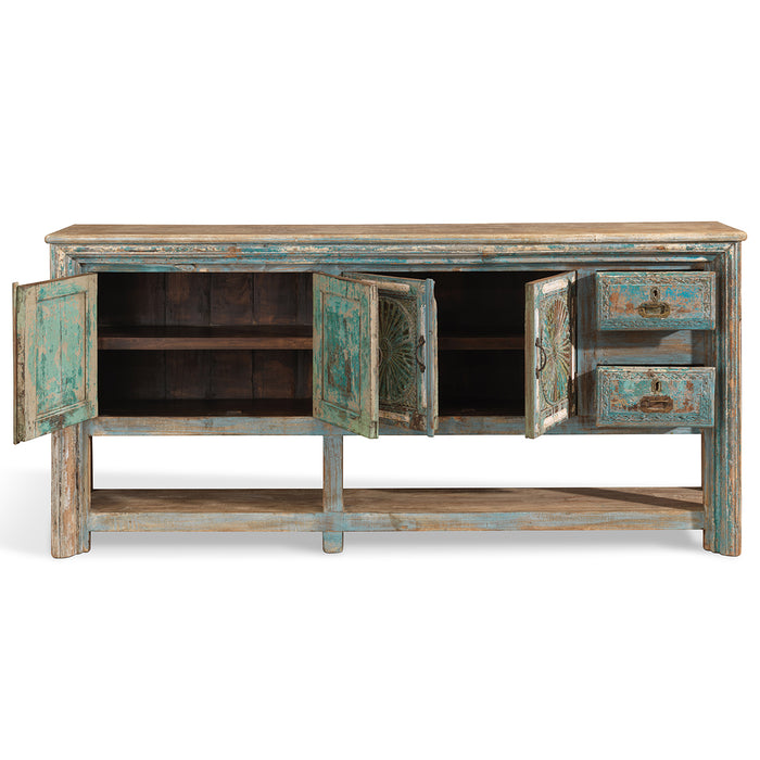 Striking in both scale and detail, this Indian sideboard is a beautifully weathered piece that combines bold craftsmanship with richly layered patina. Crafted in Gujarat from solid reclaimed wood and using old panelled doors, it features a timeworn painted finish in soft turquoise and faded natural tones, creating a look that is both vibrant and gently aged.