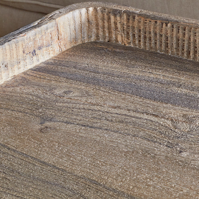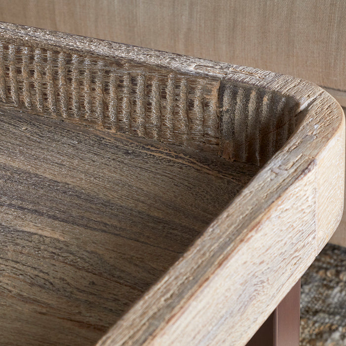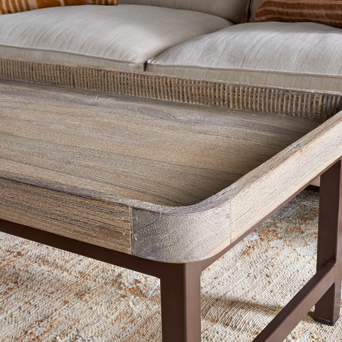 This striking coffee table unites characterful reclaimed timber with hand-forged metalwork for a distinctive, contrasting look. Its recessed tray surface, fashioned from aged Indian ceiling wood, features meticulously hand-carved edging that brings texture and refined detail. The substantial iron base, finished in warm rust tones, creates a compelling visual counterpoint to the wood's organic character. Authentic patina, grain variation, and natural irregularities distinguish each tabletop, whilst the artisanal carving and forging techniques underscore the maker's expertise and ensure singular appeal.
