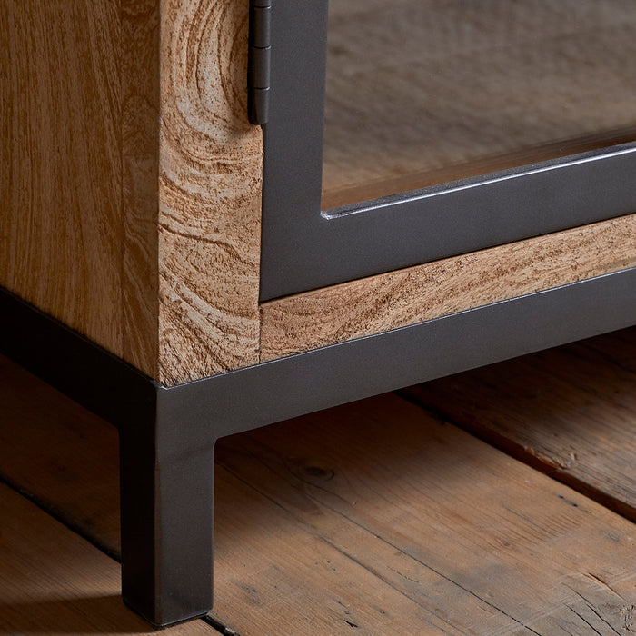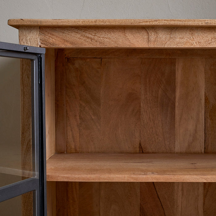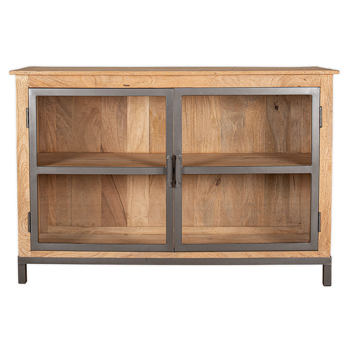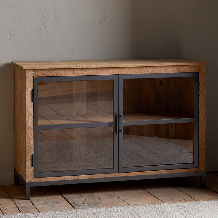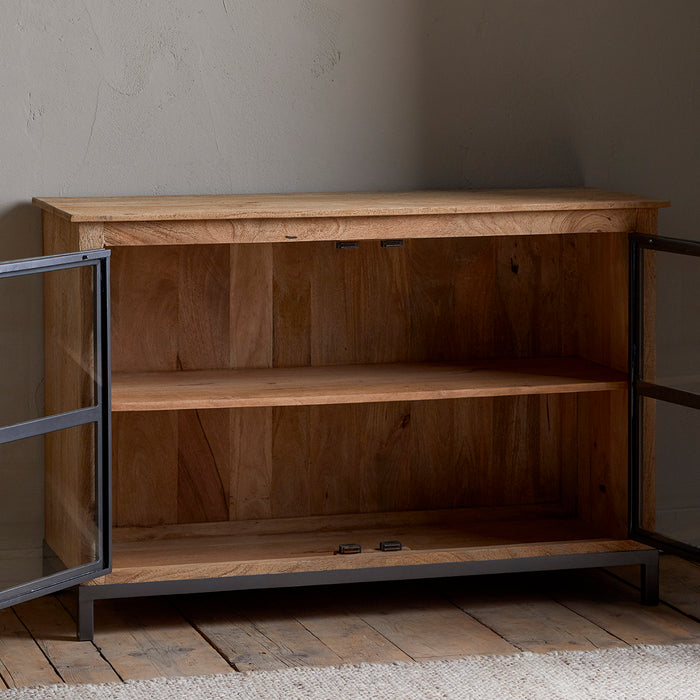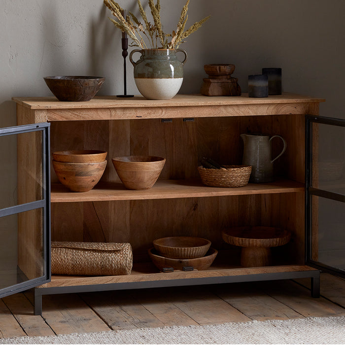 This sideboard from the Nirvi collection blends antique iron with warm mango wood, offering a striking combination of texture and colour. Its simple, elegant design and ample internal storage suits a variety of spaces including hallways, living rooms, and dining areas. Featuring a hand-welded iron frame and mango wood characterised by a light tone and distinctive grain, it perfectly combines industrial style with natural warmth. The mango wood is sustainably harvested from trees in India that no longer produce fruit and are replaced by new growth, ensuring an eco-friendly choice.