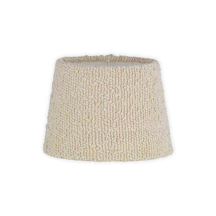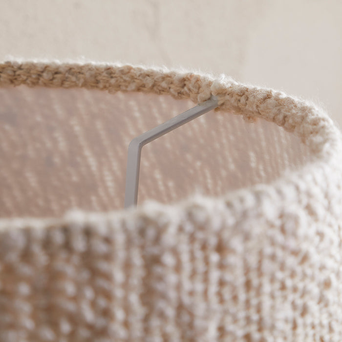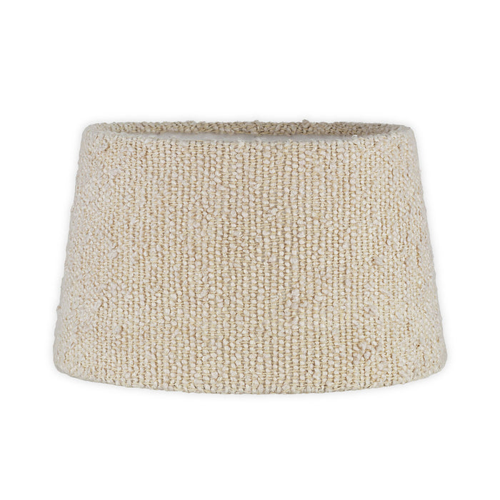 This lampshade features a soft, textured cotton bouclé fabric that adds a warm, tactile dimension to your lighting. Its delicate weave gently diffuses light, producing a soothing, ambient glow. With a neutral hue and understated pattern, it complements a range of interiors while offering a refined yet relaxed aesthetic. Expertly hand-stitched around a sturdy metal frame, the fabric’s design allows light to permeate, displaying the texture and meticulous craftsmanship of each piece.