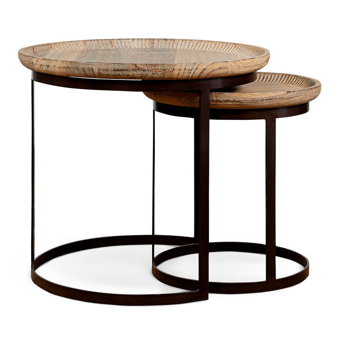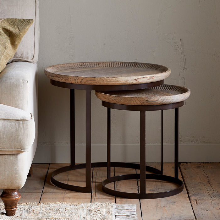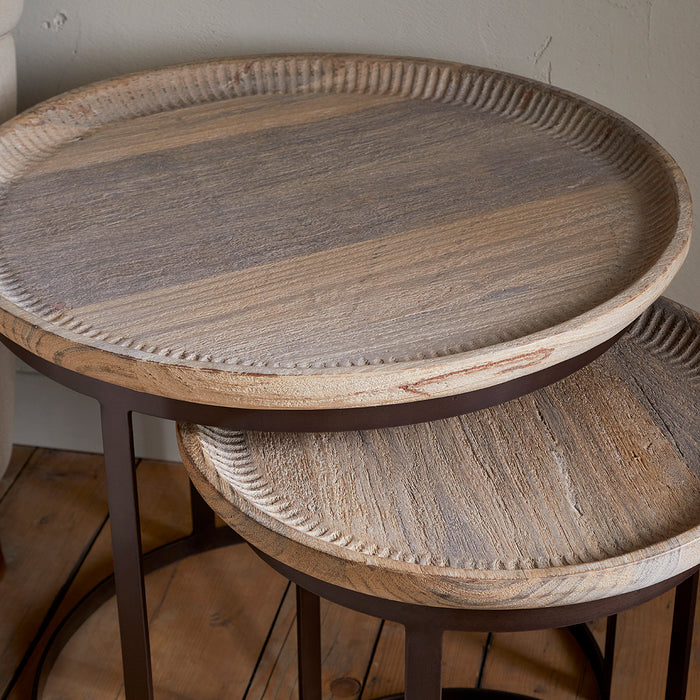 These highly versatile nesting tables marry reclaimed wood with hand-forged iron in an unusual pairing. Each table features a tray-style top salvaged from reclaimed ceiling timber, its surface defined by delicate hand-carved detailing along the inner edge. The sturdy iron base, finished in a warm rust patina, creates visual contrast against the wood's organic grain, creating an industrial but earthy look. Designed to nest compactly or display as individual accent pieces, the tables can be used together or individually as handy surfaces next to a sofa or armchair. Craftsmanship is evident throughout: the choice of timber for its unique grain and character, along with the hand-finished metalwork with its own subtle variations.