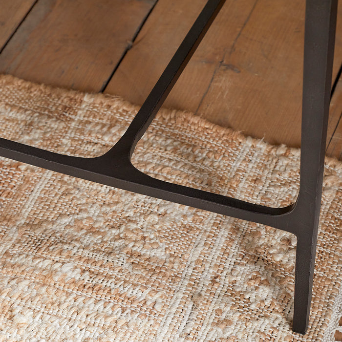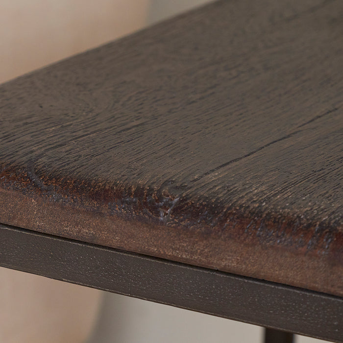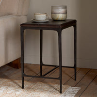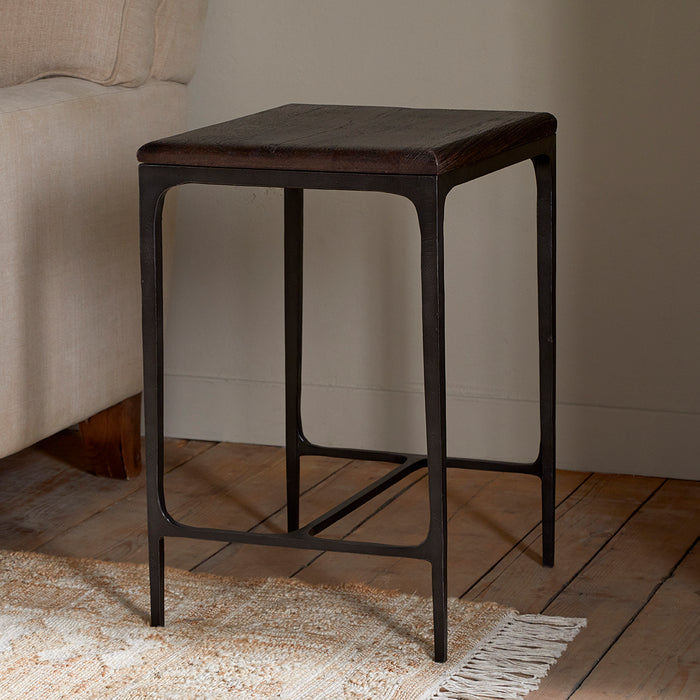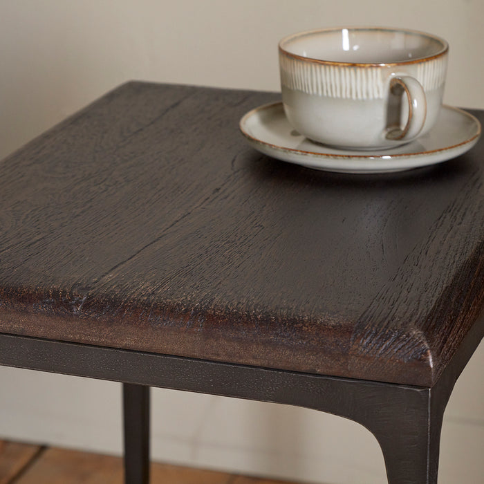 Perfectly sized to sit next to a sofa or armchair, this compact side table brings combines refined materials and minimalist style. Artfully constructed from salvaged ceiling timber, the table showcases rich chocolate tones on the top surface, accentuating the wood's inherent character and weathered patina. A solid iron framework in blackened, hammered finish provides structural elegance, featuring hand-forged tapered legs that create visual refinement. Each table is individually assembled to guarantee durability and distinctive appeal. A beautiful accent piece for living rooms, bedrooms, or reading corners.