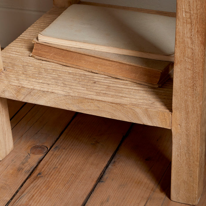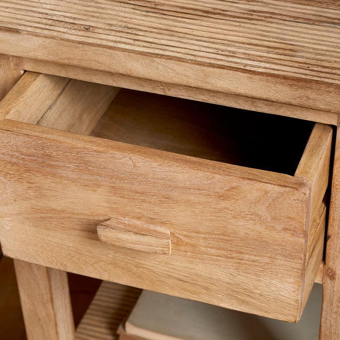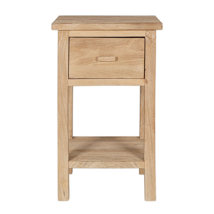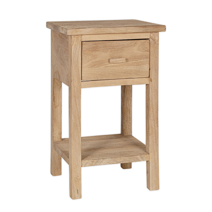This tall, slender bedside table offers understated elegance to any bedroom setting. Featuring a single drawer for essential storage and an open lower shelf for additional display or keeping items close at hand, it balances function with style. The distinctive grooved accents, characteristic of the Vivan collection, add a refined texture to its minimalist form. Expertly hand-carved and constructed from solid mango wood—valued for its durability and unique grain—this piece seamlessly complements diverse interior designs.
