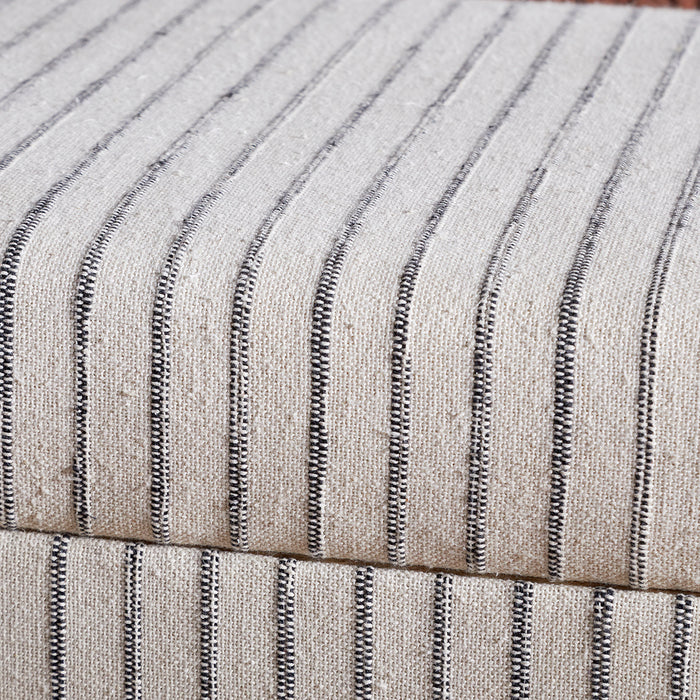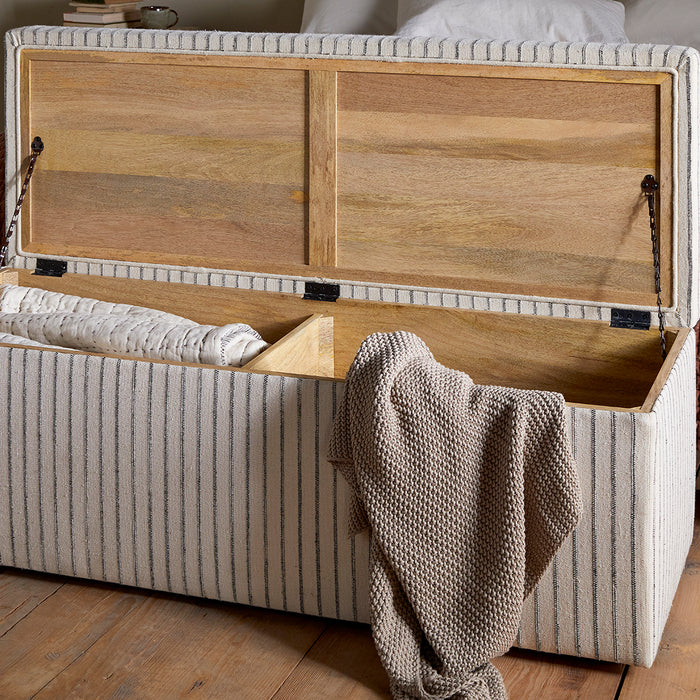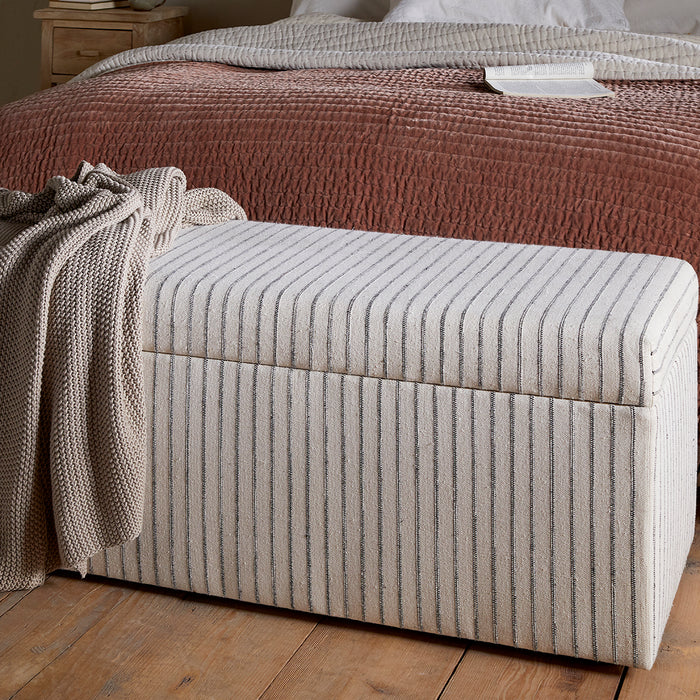 This beautifully crafted bench provides an attractive storage solution. Upholstered with a soft cotton-linen blend, it has a lovely, tactile finish and the soft, neutral tones, enhanced with subtle charcoal stripe, would fit easily into most interiors. The bench's streamlined shape and neutral tone make it easy to style, while the generous interior provides practical storage for bedding, blankets or shoes.