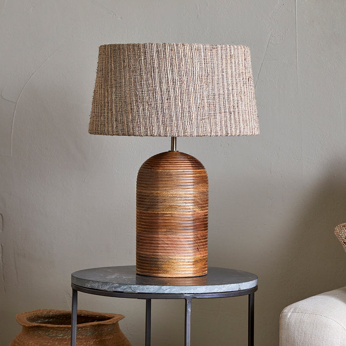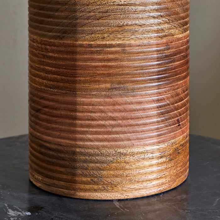 This lovely table lamp, with its hand-grooved mango wood base, brings a natural warmth and rustic charm to any room. The grooves accentuate the timber's natural grain and tonal variations, creating visual depth and enhancing the soft curves of the base, whilst maintaining compositional elegance. Hand-turned from sustainably sourced mango wood, each piece shows the distinct markings and colour nuances that reflect both the wood's origin and the maker's touch. The tactile form and natural tones create a relaxed sense of calm, making the lamp ideal for creating an ambient atmosphere in a bedroom or living space.