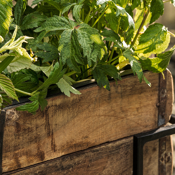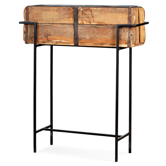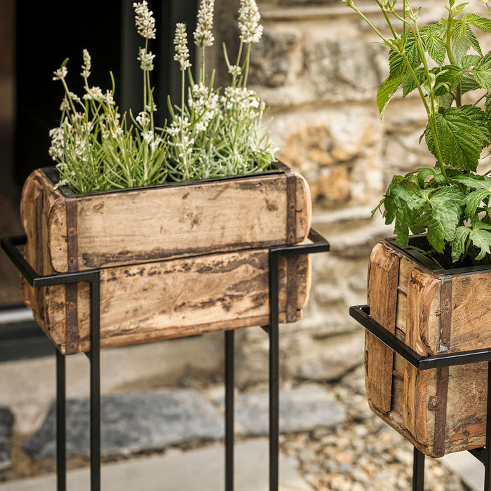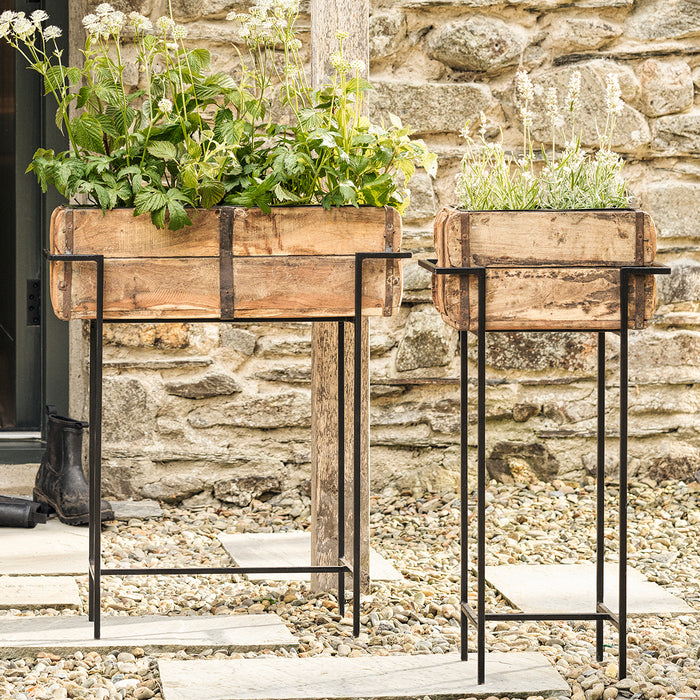 Combining industrial aesthetics with historical provenance, these planter stands showcase two substantial wooden planter boxes set within a robust metal framework. The boxes were originally used in traditional brick-making, lending genuine character and narrative to each piece. The design offers both functional display and visual interest through contrasting materials and proportions. The antique patina and clean lines of each planter bring a distinctive, utilitarian edge to any space. Suitable for indoor use or covered outdoor areas only.