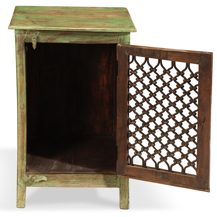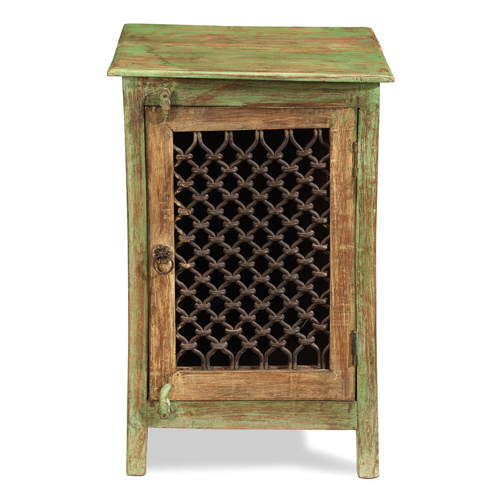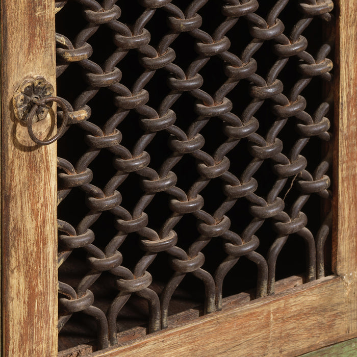 The front door is fitted with an intricate metal lattice panel, offering a unique decorative element while allowing subtle visibility and airflow. Finished with a simple iron ring handle and traditional latch, it reflects the understated craftsmanship found in heritage Indian furniture.