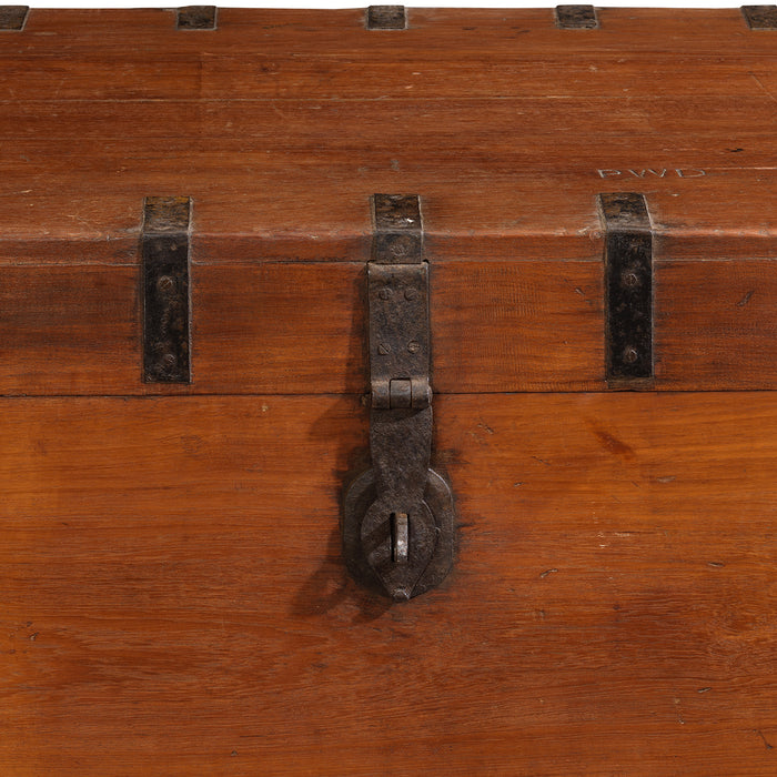 Historically, chests of this scale were used throughout India for storing and transporting textiles, clothing, household goods, and valuables. Their robust construction made them ideal for long-term storage and travel, while their generous proportions allowed families to keep bedding, garments, or seasonal items safely stored. This one still has initials, presumably of the original owner, 'PWD', carved onto the lid.