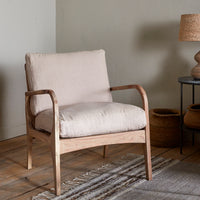 Crafted from sustainably sourced acacia wood, this beautifully crafted chair showcases artisanal detailing through its hand-carved armrests and gracefully curved profile. The natural warmth of the timber pairs seamlessly with soft linen upholstery, creating a refined piece that balances sculptural elegance with everyday comfort. Its understated aesthetic, organic materials and neutral palette make it equally at home as a bedroom accent or living room focal point, offering both visual sophistication and functional versatility.