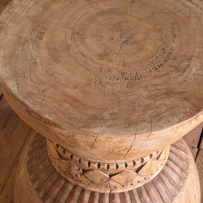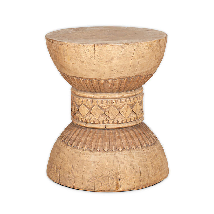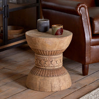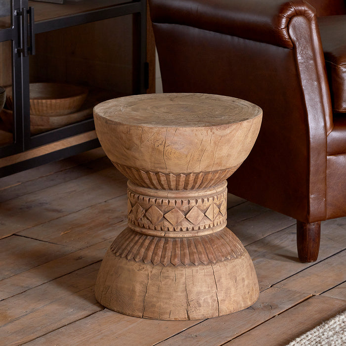 With its bold silhouette and rustic finish, this hand-carved side table adds natural warmth and character to any room. Handcrafted from solid wood, it features a traditional Indian design that brings sculptural interest and earthy texture to your space. The compact form makes it ideal as a side table or statement piece, blending effortlessly into both contemporary and classic interiors.
