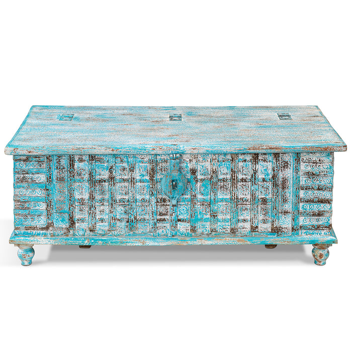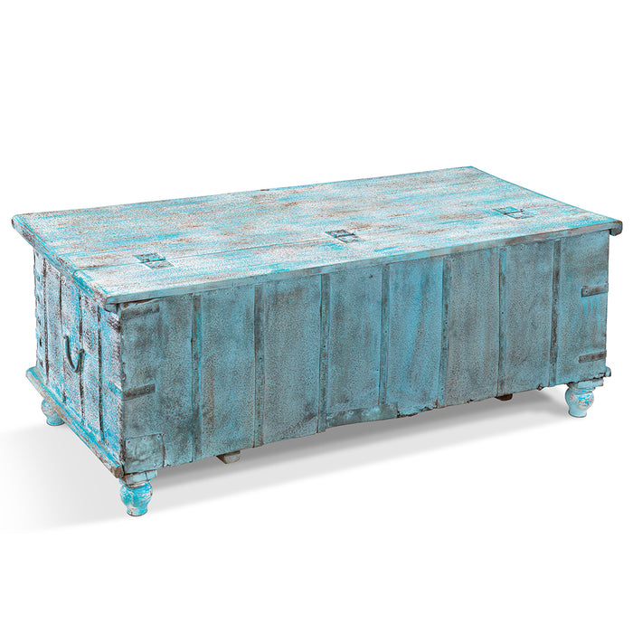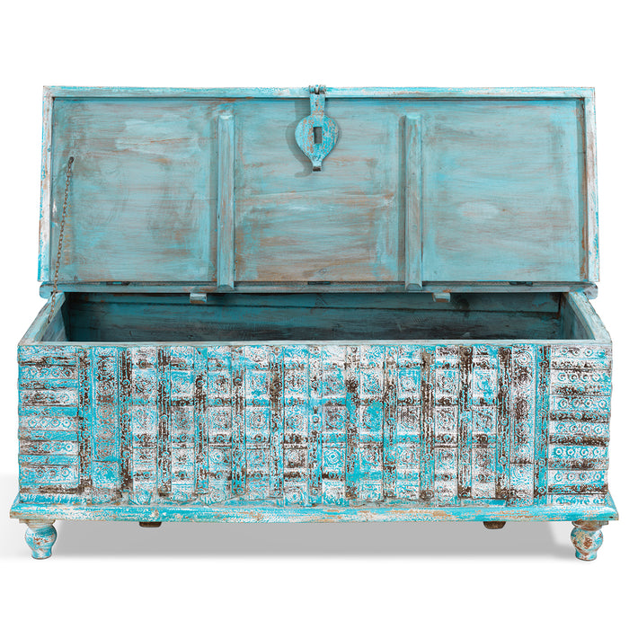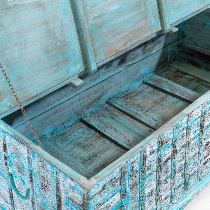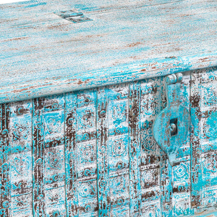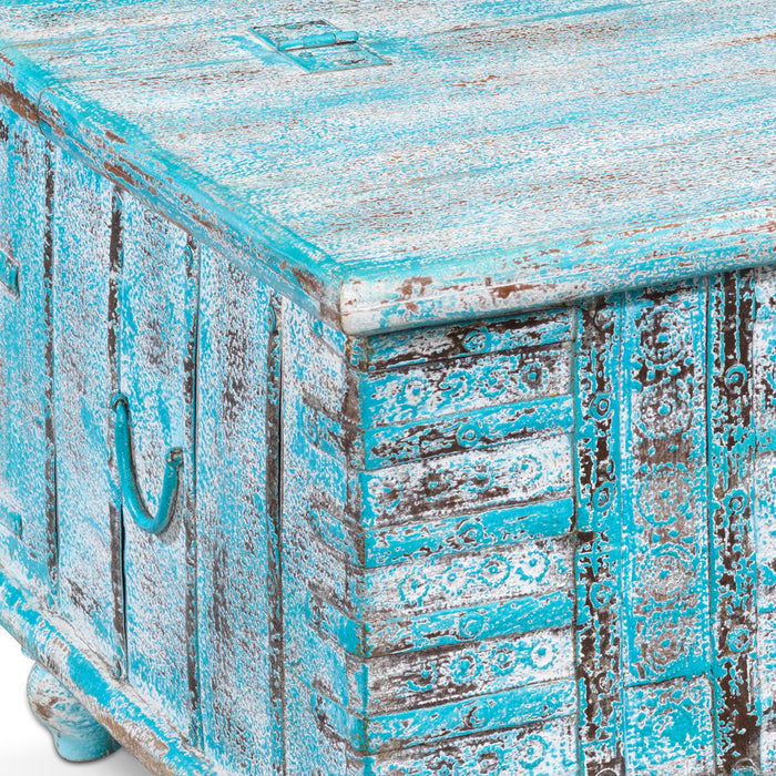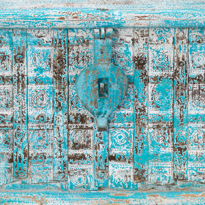 This striking vintage Indian storage chest is a beautifully characterful piece, showcasing traditional craftsmanship and a richly weathered finish. Crafted from solid wood, the chest retains its original turquoise painted surface, now gently distressed through time to reveal layers of natural timber and earlier paint beneath. The result is a wonderfully textured patina that gives the piece depth, warmth and individuality.